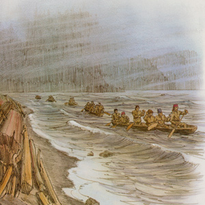 The dugout canoes are safely run down the Short Narrows of the Columbia astonishing the local onlookers. Below the narrows, the expedition encounters their first Chinookan-speaking People.