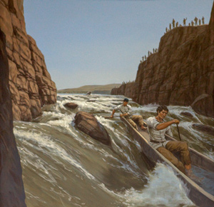 The men line the heavy dugout canoes down the Horseshoe Bend of Celilo Falls while Lewis trades their smallest dugout, a hatchet, and a few trinkets for a Chinook-style canoe. Clark shoots at a sea otter.