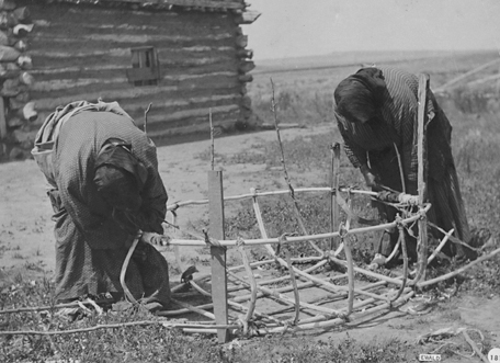 These Mandan women—Owl Woman and Many Grows—are building a “compact” model, suitable for transporting one or two persons across a river. These photos were taken around 1910, when there were very few bison left in North America; the animal hide they used appears to be that of a domestic Hereford cow.