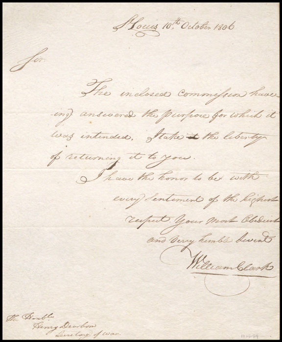 In St. Louis, the captains attend to post-expedition details. William Clark resigns his commission as Lieutenant in the Corps of Artillerists, and Meriwether Lewis writes discharge papers for Pvt. William Bratton.