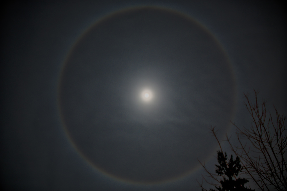 Thert. at 4 P.M. Weather Wind at 4 P.M. River 20 below [0] fair N W 16 below [0] fair N W raise 1 in. singular appearance of three distinct Halo or luminus rings about the moon appeared this evening at half after 9 P. M. and continued one hour. the moon formed the center of the middle ring, the other two which lay N & S. of the moon & had each of them a limb passing through the Moons Center and projecting N & S a simidiameter beyond the middle ring to which last they were equal in dimentions, each ring appearing to subtend an angle of 15 degrees of a great circle