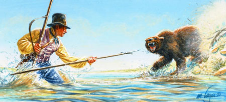 I scelected a fat buffaloe and shot him very well, through the lungs . . . . and having entirely forgotton to reload my rifle, a large white, or reather brown bear, had perceived and crept on me within 20 steps before I discovered him . . . . I had no sooner terned myself about but he pitched at me, open mouthed and full speed, I ran about 80 yards and found he gained on me fast . . . . I ran haistily into the water about waist deep, and faced about and presented the point of my espontoon . . . . sudonly wheeled about as if frightened, declined the combat on such unequal grounds, and retreated with quite as great precipitation as he had just before pursued me.