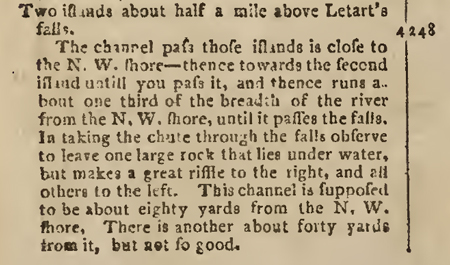 The channel pass those islands is close to the N. W. shore—thence towards the second island untill you pass it, and thence runs about one third of the breadth of the river from the N. W. shore, until it passes the falls. In taking the chute through the falls observe to leave one large rock that lies under water, but makes a great riffle to the right, and all others to the left. This channel is supposed to be about eighty yards from the N. W. shore. There is another about forty yards from it, but not so good.[1]Zadok Cramer, The Navigator: Containing Directions for Navigating the Monongahela, Allegheny, Ohio and Mississippi Rivers… (Pittsburgh: Zadok Cramer, Bookseller & Stationer, 1802), 28.