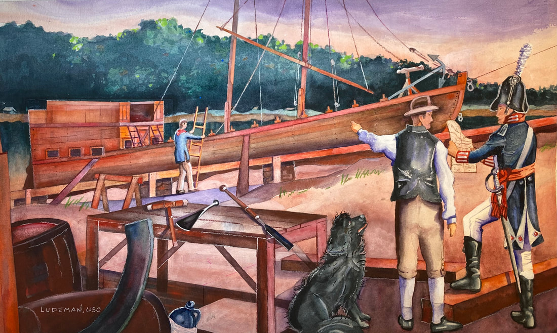 Meriwether Lewis anxiously awaits completion of the barge so that he can head down the Ohio River.