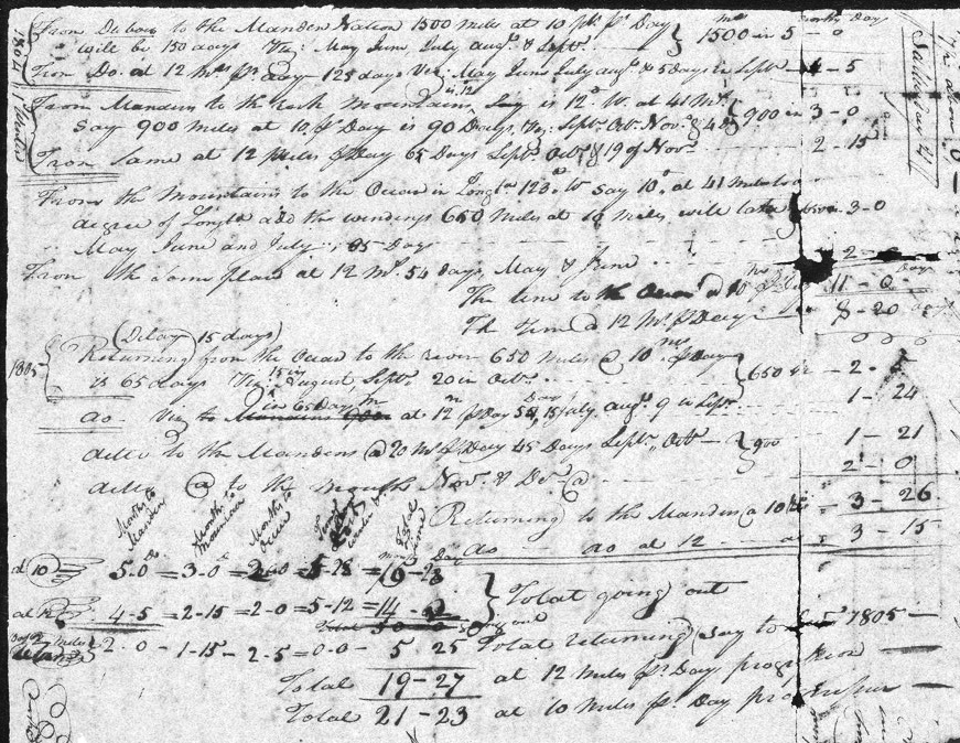 mls months days 1804{ From Dubois to the Manden Nation 1500 miles at 10 mes. pr Day will be 150 days Viz: May June, July Augt. & Sept.— }1500 in 5 0 From Do. at 12 mes. pr. day—125 days Viz: May June July Augt. & 5 days in Septr 4 5 —William Clark, undated field note[2]This table has been created from Moulton, Journals, 2:159 and Ernest S. Osgood, The Field Notes of William Clark, 1803–1805, Document 7 (New Haven and London: Yale University Press, 1964), 19 and … Continue reading