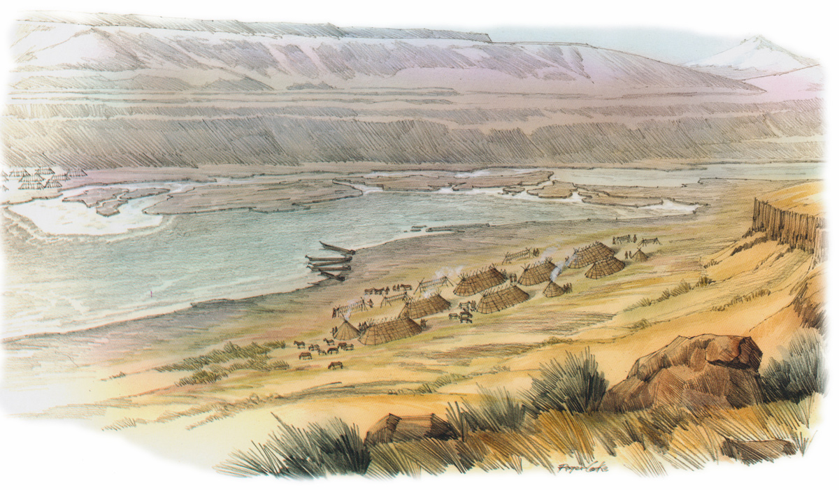 With Mt. Hood in the background, this viewpoint is above a Wishram village with several lodges covered with bulrush (tule) mats. Celilo Falls had many falls, channels, and narrow chutes. Across the river is Horseshoe Bend, the largest fall.