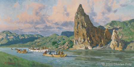 The day brings endless ‘scenes of visionary enchantment’ as the enlisted men struggle to move the boats through the White Cliffs of the Upper Missouri River Breaks. When a tow rope breaks, Lewis once again mentions the white pirogue‘s ‘evil genie’. After passing Citadel Rock and Grand Natural Wall, they camp at present Eagle Creek where Lewis notices a distinctive species of pine.
