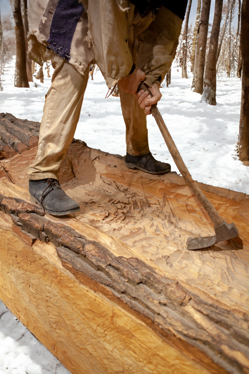 At the canoe camp away from Fort Mandan, Pvt. Shannon cuts his foot with an adze. Surrounding the Knife River Villages, some Hidatsas burn off dead winter grass making the air smoky.