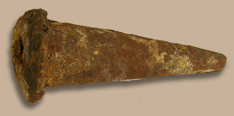 This object was recovered by archaeologists in 1950 from the site of one of the Mandan villages (see Figure 1). It is thought to have been the revolving core or “runner” with its teeth either filed or rusted off. The head end, at left, shows evidence of having been worked on with a hammer, perhaps in a Mandan’s effort to make it into a more practical object.