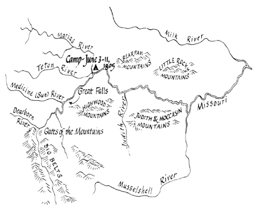 Next, consider Lewis’s most famous discovery, the Great Falls of the Missouri. The Hidatsa told the captains that reaching this feature was the sure sign that they were on the correct route to the Columbia. This point was so axiomatic in the expedition’s understanding of western geography that it served as the solution to the quandary faced by the party at the surprising appearance of the Marias River. Then and there Pierre Cruzatte and the other men in the detachment forced the captains’ hands on the question of which branch of the river was the route to the headwaters of the river. Lewis complained that, contrary to his and Clark’s opinion, Cruzatte, “an old Missouri navigator . . . had acquired the confidence of every individual of the party . . . that the N. fork [the Marias] was the true genuine Missouri.” Indeed, the men were “so determined in this beleif, and wishing that if we were in error to be able to detect it and rectify it as soon as possible it was agreed between Capt. C. and myself that one of us should set out with a small party by land up the South fork [the Missouri] and continue our rout up it untill we found the falls.”[14]JLCE, 4:271.