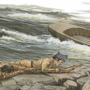On this wet spring day at the Cascades of the Columbia, the men tow four dugout canoes through the “big Shoote.” Hostilities ensue when a few local Natives start stealing things. Even Lewis’s dog Seaman is stolen.