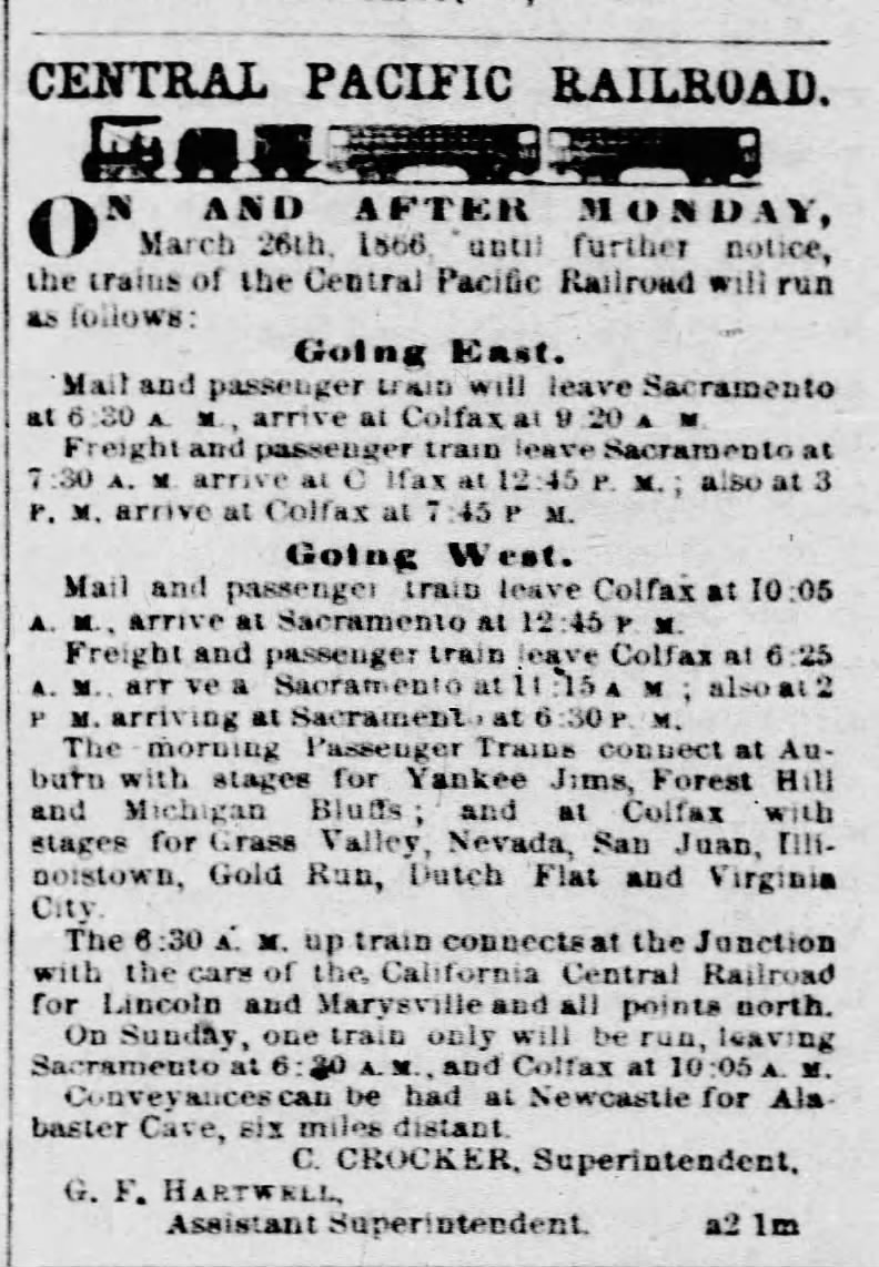 Freight and passenger train leave Sacramento at 7:30 A. M. arrive at Colfax at 12:45 P. M.; also at 3 P. M. arrive at Colfax at 7:45 P. M.The morning Passenger Trains connect at Auburn with stages for Yankee Jims, Forest Hill, and Michigan Bluffs; and at Colfax with stages for Grass Valley, Nevada, San Juan, Illinoistown, Gold Run, Dutch Flat and Virginia City.