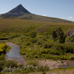 In 1805, Lewis viewed the Rocky Mountain Front from a vantage point similar to that in the above photo, but he did not appear to recognize the buttes as Fidler’s Battle Hills. From left to right is Crown Butte, Shaw Butte, and Square Butte. Square Butte—Lewis’s “Fort Mountain”—is nearly 1,000 feet above the surrounding prairie, and is about 1,100 acres on top.