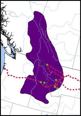 The purple figure encompasses the area in which Columbian ground squirrel colonies may be found. The dotted red line represents the Corps of Discovery’s travel route through the west. The green dots indicate approximate locations where they encountered the species. Columbian ground squirrels are native to southeastern British Columbia and southwestern Alberta, eastern Oregon and Washington, northern Idaho and western Montana.