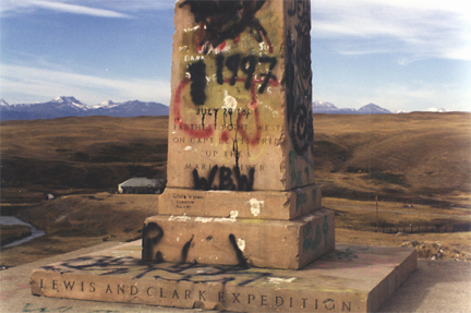 Graffiti covers all surfaces of the monument, as high as a person can reach, with tags over tags. It’s been “hit up” and “gone over.” From the perspective of white culture, a historic shrine has been defiled. On the other hand, considering the fact that the only blood spilled on the entire Lewis and Clark expedition was that of two Blackfeet men, tribal members have no reason to respect a monument to Lewis’s presence on their turf.