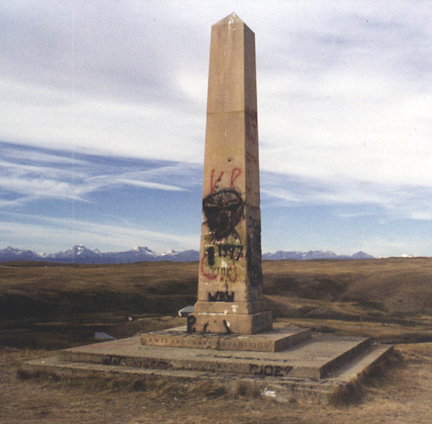 The obelisk pictured here stands a few yards north of U.S. Highway 2 on the Blackfeet Indian Reservation, a few miles south of the presumed location of Camp Disappointment, which is on private land. It was erected in the 1890s by the Great Northern Rail. The inscription, partly obliterated by the “going over,” reads, “July 22, 1806/Farthest point west on Capt Lewis trip up the Marias River.” On the western horizon is the spectacular Rocky Mountain Front.