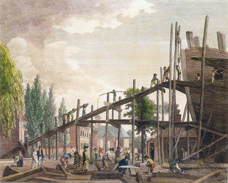 The Swedish Church in the background, known as Gloria Dei or Old Swedes’, was begun in 1698. The keel for the frigate Philadelphia was laid exactly a century later at Humphrey’s shipyard in Southwark. It was built by the Commonwealth of Pennsylvania, with financial assistance from many of the citizens whose city had been the new nation’s capital for ten years and was feared to be vulnerable to foreign capture and occupation during the war between France and England. The danger was past by 1800, but the Philadelphia was destined to play a major role in the First Barbary War of 1801-1805, and in the creation of America’s first military hero, Stephen Decatur, Jr.